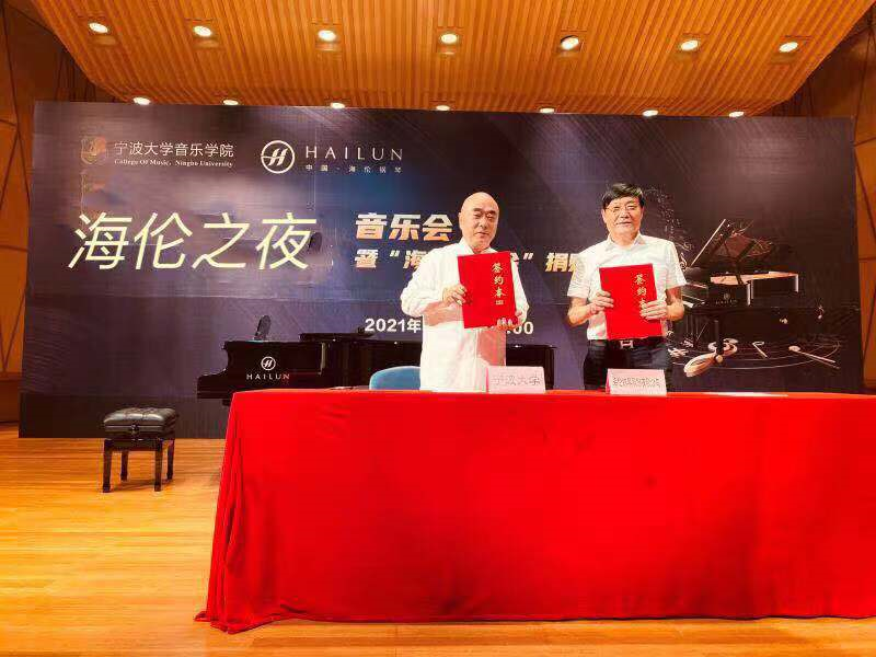 寧波大學音樂學院俞子正先生與海倫鋼琴股份有限公司董事長陳海倫先生簽訂捐贈協議,由寧波大學副校長趙全軍先生向海倫鋼琴股份有限公司董事長陳海倫先生頒發捐贈證書。