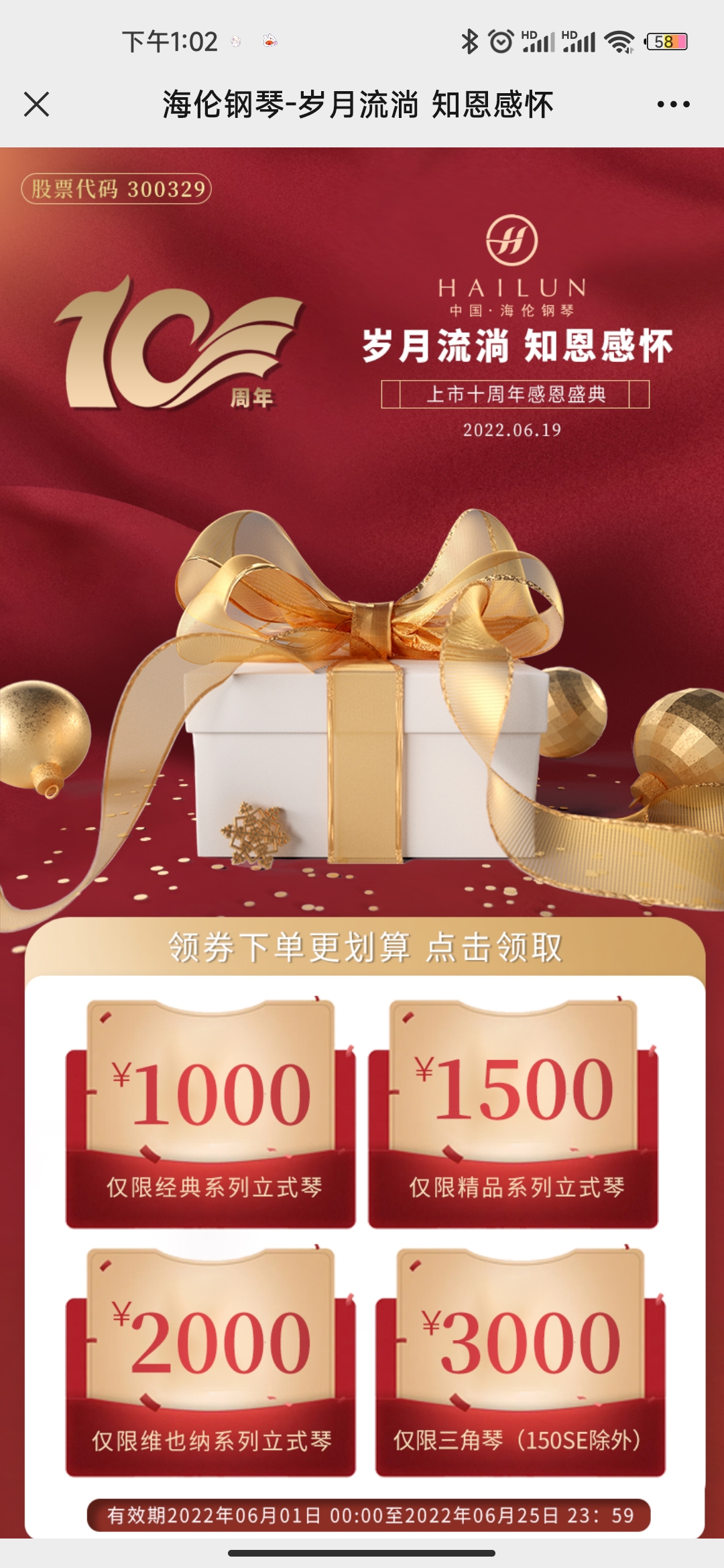 關(guān)注“海倫鋼琴”官方微信公眾號(hào),回復(fù)“上市十周年”,點(diǎn)擊領(lǐng)取福利進(jìn)入領(lǐng)券頁面;