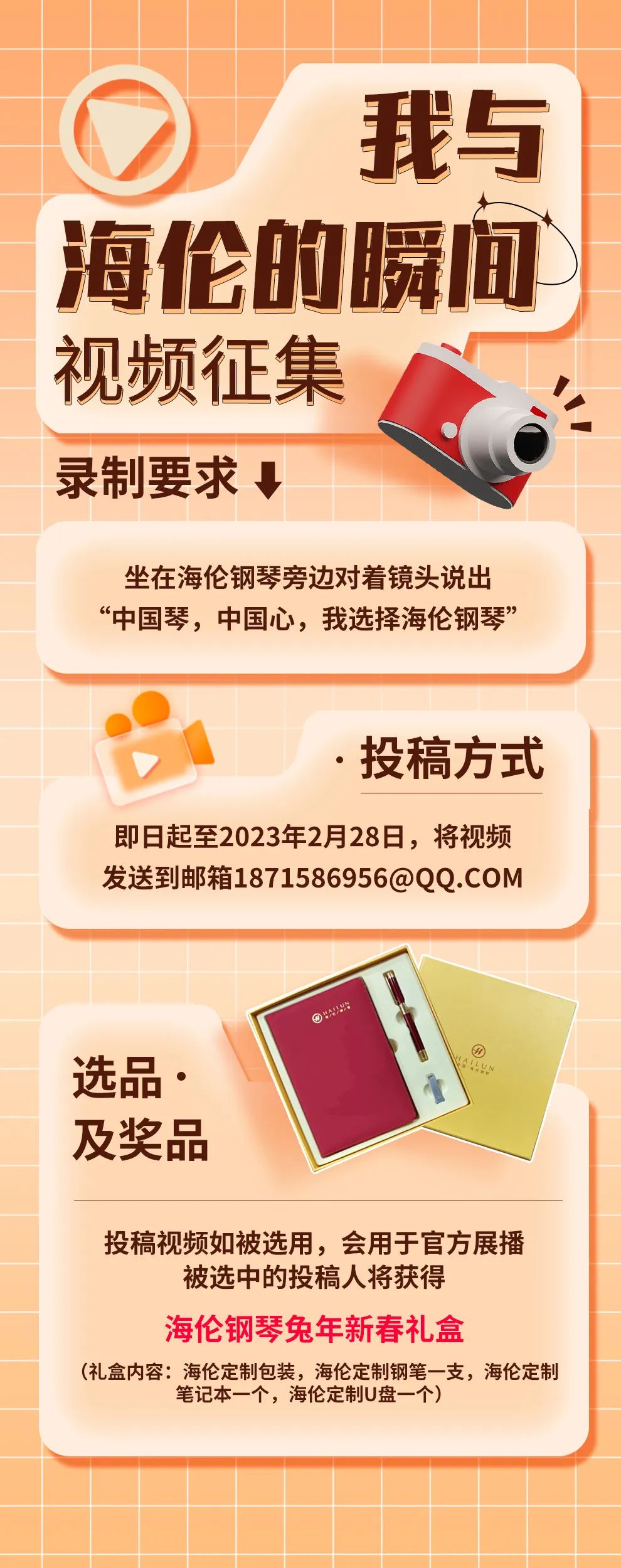 ● 錄制視頻時長控制在15秒以內(nèi),要求為MP4格式,橫屏錄制(16:9),拍攝光線良好,環(huán)境背景不雜亂、錄制畫面上可見海倫鋼琴logo、視頻不得進行后期剪輯和音頻調(diào)整。