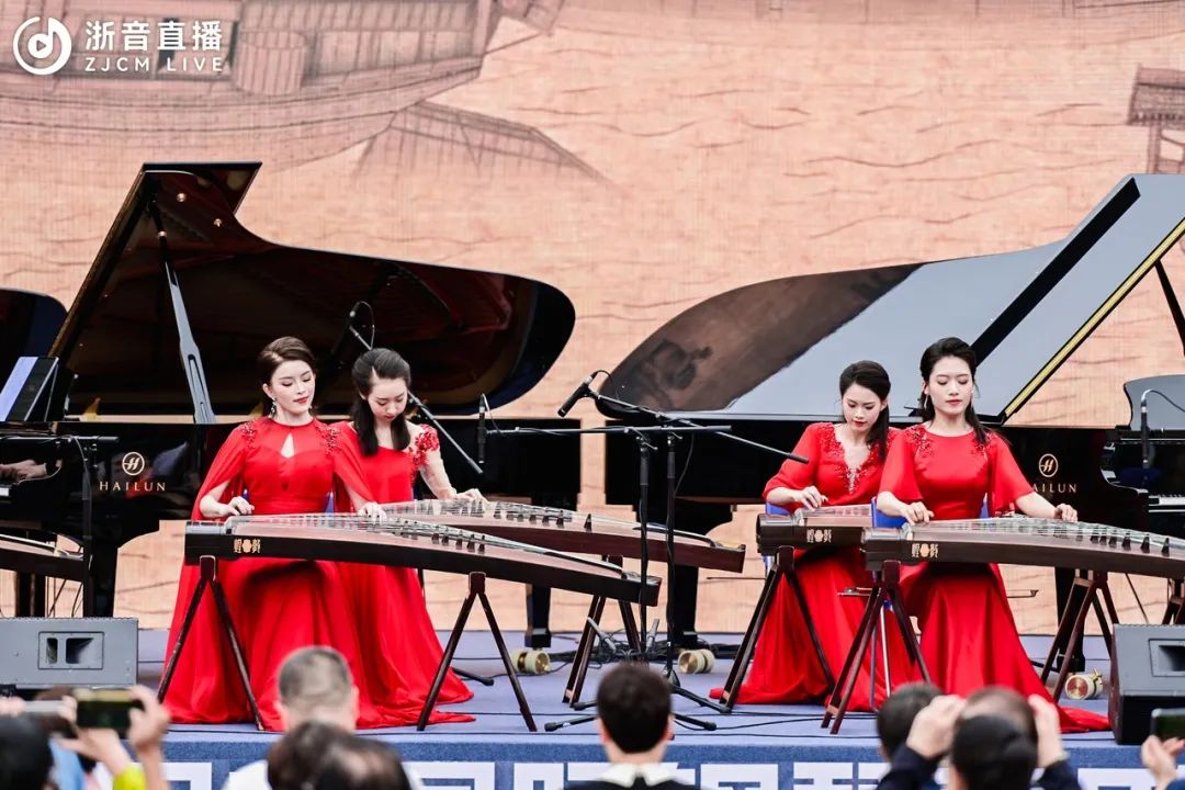 音樂會由詩朗誦《天目山:浮玉的歌唱》,以及浙音翡翠箏團帶來的古箏合奏《夢回臨安》《英雄贊歌》《綠風》暖場開幕。典雅精妙的樂曲中,既有“陌上花開緩緩歸”的雋雅秀美,又有“烽煙滾滾唱英雄”的慷慨激昂,現場觀眾們瞬間被帶入一場綺麗的水鄉故夢中,在音樂中遍覽繁花似錦、璀璨明亮的錦繡山河。