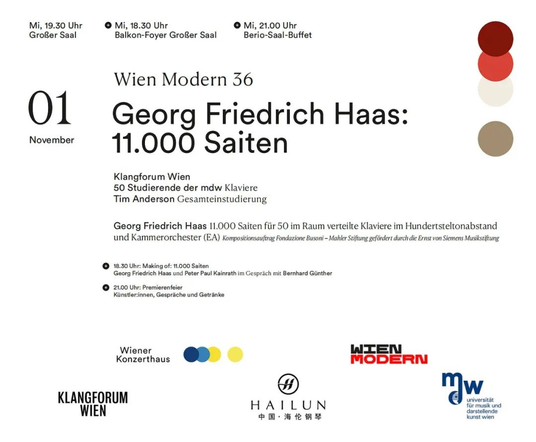 北京時間11月1日,繼博爾扎諾世界首演后,“宇宙之聲”項目《11,000根弦》將在維也納音樂廳再度獻(xiàn)演,這次演出是維也納現(xiàn)代音樂節(jié)(Wien Modern)的重磅推出節(jié)目,由維也納聲音樂團及50位鋼琴家在50架海倫鋼琴上奏響,這是奧地利著名作曲家喬治·弗里德里希·哈斯(Georg Friedrich Haas)受“費魯奇奧·布索尼·古斯塔夫·馬勒基金會”委約而為室內(nèi)樂隊與50臺鋼琴而創(chuàng)作的《11,000根弦》。