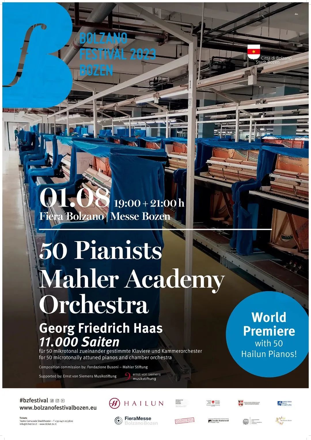 這是奧地利著名作曲家格奧爾格·弗里德里希·哈斯(Georg Friedrich Haas)受“費(fèi)魯奇奧·布索尼·古斯塔夫·馬勒基金會(huì)”委約而為室內(nèi)樂隊(duì)與50臺(tái)鋼琴而創(chuàng)作的《11,000根弦》的世界首演,在博爾扎諾音樂節(jié)上完美演出。