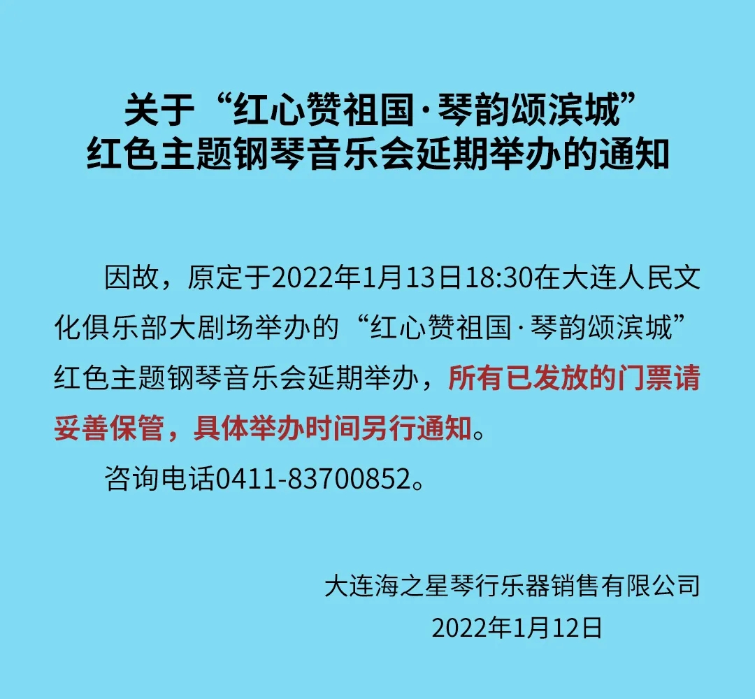 緊急通知丨大連紅色主題鋼琴音樂會演出推遲